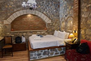 Our visit to Mystras was followed by a delicious lunch in Sparta that included tzatziki and other dips, a salad, and moussaka, with a custard dessert. Our next stop was at a winery where we had tastes. Then we arrived at Nafplio, where we would spend two night. Our hotel was fascinating, because each room was decorated differently. Some of the rooms had stone interiors, making them resemble caves. Our room, as well as several others, was up five flights of steps.